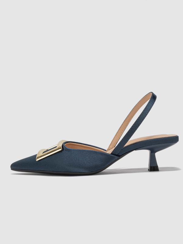 Glamorous Navy Blue Slingback Pumps For Women, Satin Metal Decor Point Toe Pyramid Heeled Pumps navy blue satin pumps