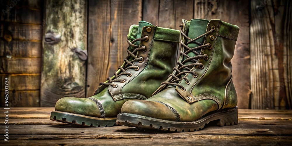 8. A pair of olive drab combat boots, scuffed and muddy, standing upright on a worn wooden board olive drab boots