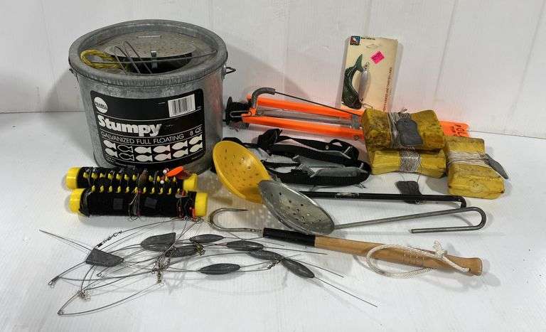 Frabill stumpy galvanized full floating 8-quart minnow bucket, ice cleats, Gaff, (2) strainers frabill ice cleats