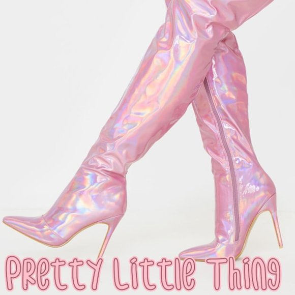 PrettyLittleThing | Shoes | Iso Pink Holographic Thigh High Boots Us Or 11 | Poshmark holographic thigh high boots